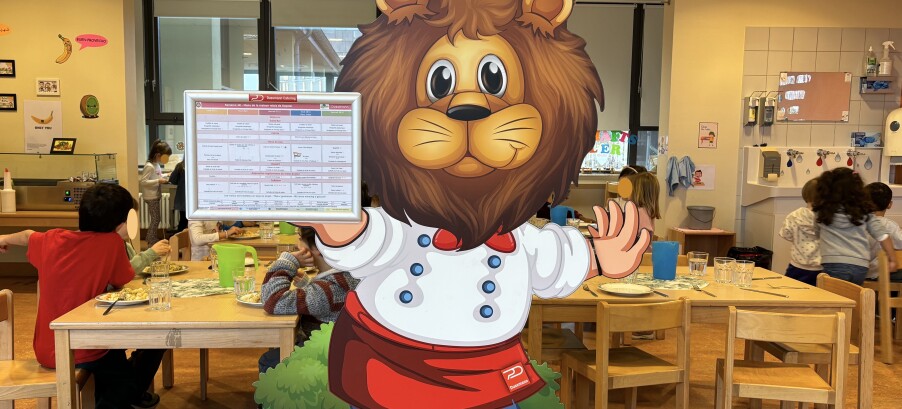 Avec l’aide de la mascotte Léo, mise à disposition par Dussmann Catering, les éducateurs, en collaboration avec la cuisine, présentent aux enfants de façon ludique le plat du jour. Le cuisiner photographie le repas quotidien et l’accroche sur Léo afin que les plus petits puissent bien voir ce qu’ils mangent à midi. Afin d’interagir davantage avec Léo, les enfants et les éducateurs peuvent le déguiser ou le décorer selon la saison, ou alors se servir de lui afin de présenter des produits régionaux et saisonniers.
