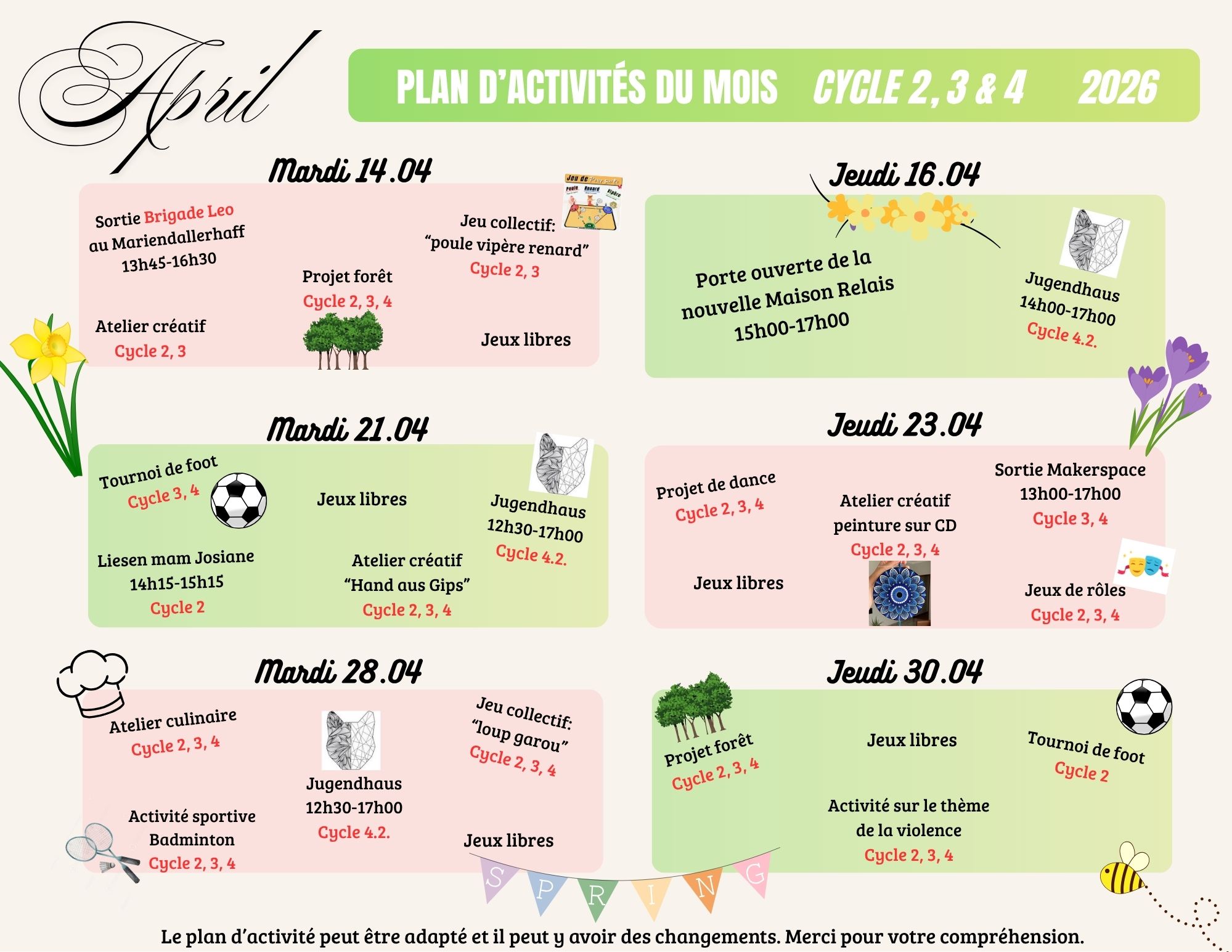 Veuillez svp équiper votre enfant d’un sac à dos avec un t-shirt, un pantalon jogging (pas de short) et des chaussettes anti-dérapantes.